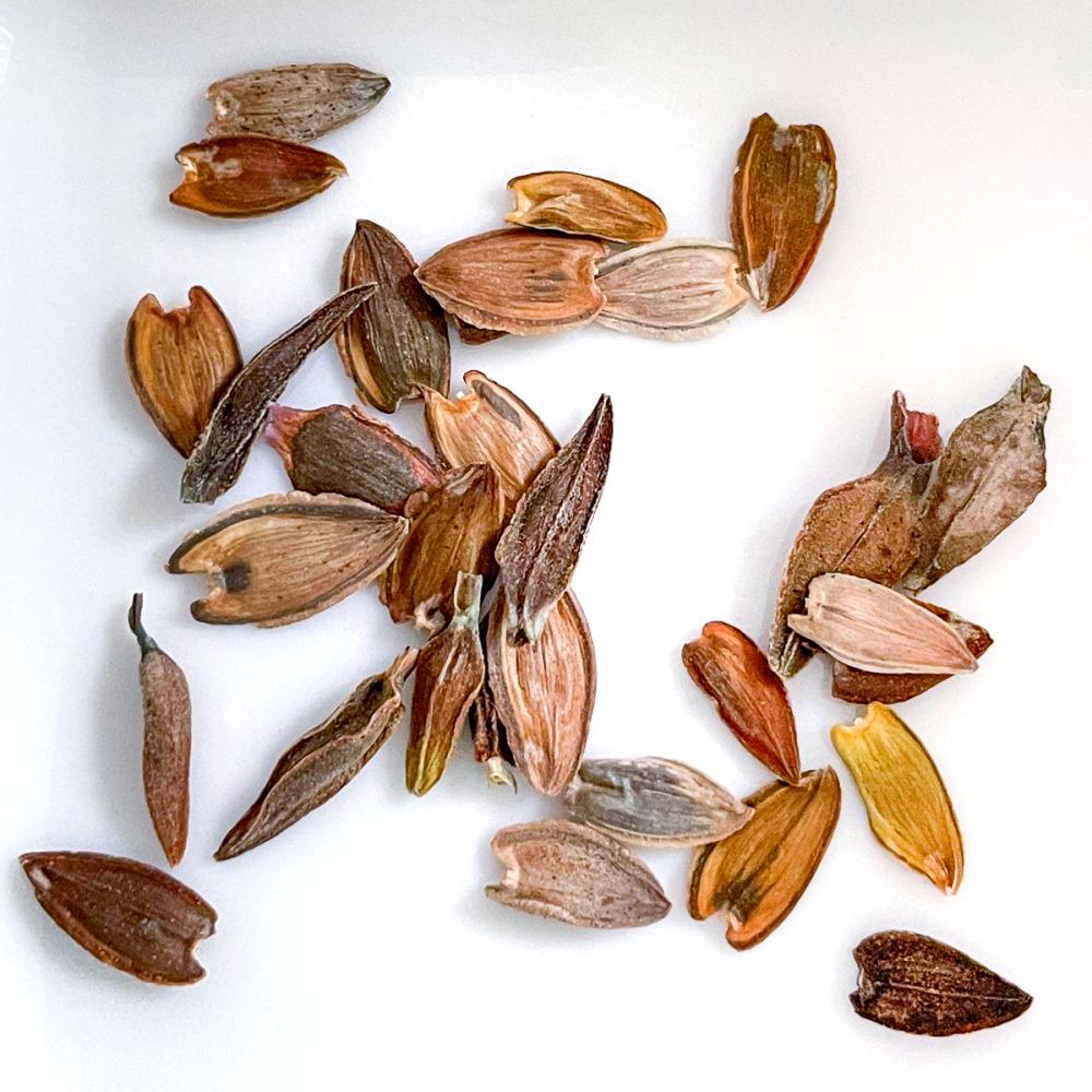 البذور بيضاوية صغيرة الحجم مسطحة ملساء ذات لون رمادي إلى بني