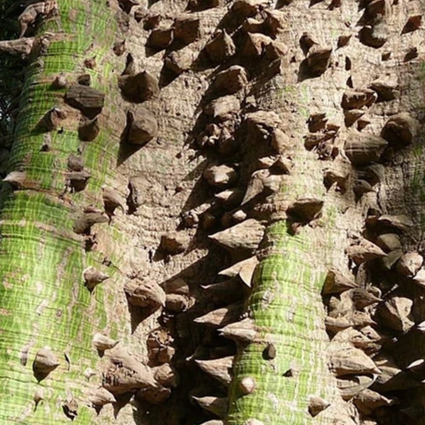 الجذع أسطواني ومنتظم ولحاء رمادي مغطى بأشواك مخروطية حادة وقاعدة واسعة، ويصل ارتفاعه إلى 40 مترًا وقد يزيد على ذلك