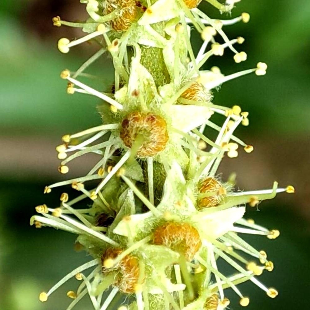 الأزهار إبرية صغيرة صفراء مائلة للخضرة تتكون على سنابل في الأطراف بطول يتجاوز 10 سنتيمتر